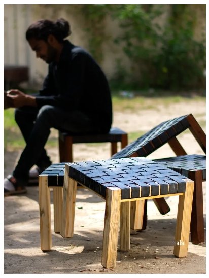The top sitting layer of this stool is handweaved intricately from old tyre tubes, which minimizes the cause of pollution, and much more hazardous activities caused by burning old tyres to nature as well as to humans.